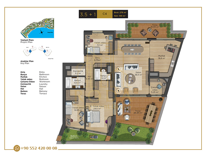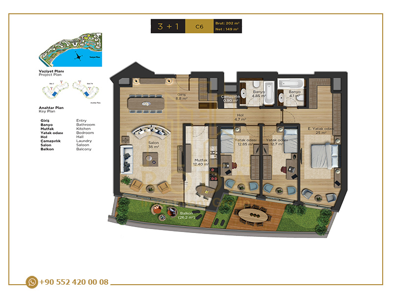 | يقع المشروع الفاخر في منطقة أتاكوي على الجانب الأوروبي من اسطنبول،وهو مشروع عقاري متعدد الاستخدامات يضم وحدات سكنية تطل على واجهة بحرية كاملة، وتمتاز بنمط حياة راقية ذات جودة استثنائية في التفاصيل والعلامات التجارية فضلاً عن الموقع الفريد.يتكون المشروع من 8 أبراج سكنية تضم 1.480 وحدة سكنية، وفندق 5 نجوم يضم 120 وحدة فندقية خاصة و 95 شقة فندقية، ومحلات تجارية، وتتمتع جميع وحدات المشروع بما في ذلك غرف الفندق بإطلالة رائعة على البحر ويحظى المشروع بطريق مباشر يصل إلى ساحل أتاكوي، وتم تخصيص أكثر من 100 ألف متر مربع للمساحات الخضراء التي تتألف من تشكيلات نباتية ومناظر طبيعية فريدة وحدائق على الطراز الباروكي التي تكسوها أشجار الصنوبر. بفضل تصميمه المتميز، أصبح مشروعنا الفريد في أتاكوي الوحيد في إسطنبول الذي يطل على ساحل البحر بواجهة متصلة مباشرة تستمتع بها كل وحدة من وحدات المشروع، وبإمكان السكان الاستفادة من المرسى البحري والمطار الدولي ومراكز التسوق وفندق فاخر على مستوى عالمي. |
